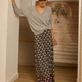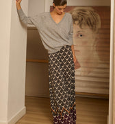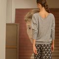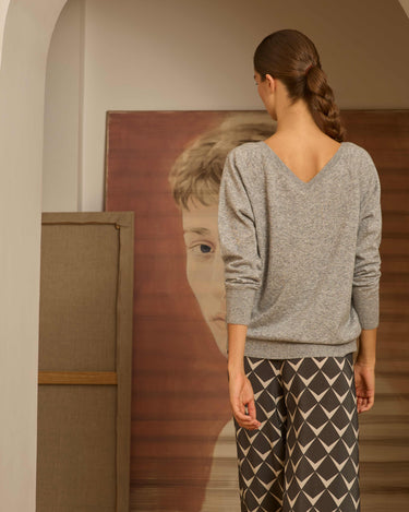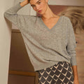 Jersey gris de manga larga con hilatura con un sutil brillo. Tiene escote pico en la parte delantera y trasera