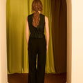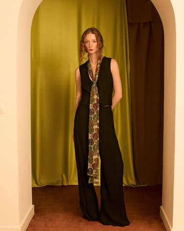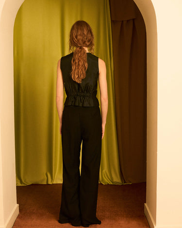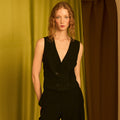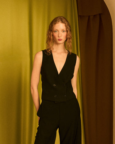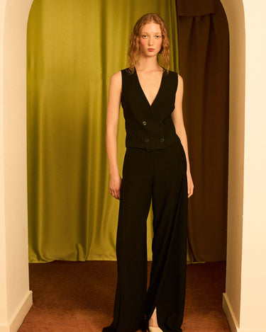 Chaleco de sastrería en crep en color negro con triple abotonadura y bolsillos. Detalle en la parte trasera. Hecho en EspañaP542.115.CHL.4116-600_XS