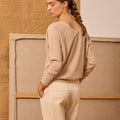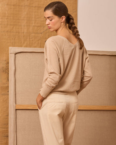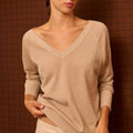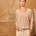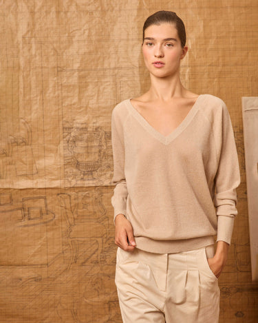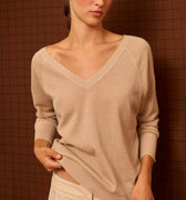 Beige long-sleeved sweater with a subtle sheen. It features a V-neck at the front and back.