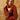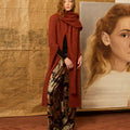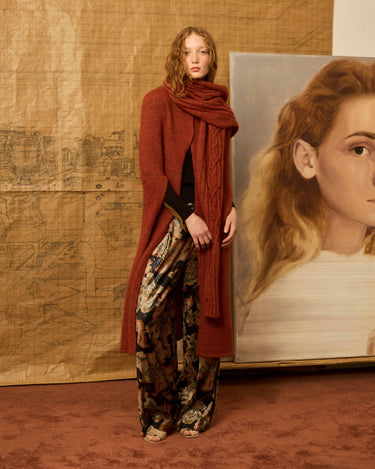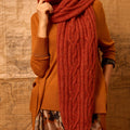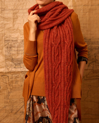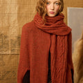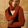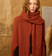 Scarf with sleeves that allow you to slide your arm through and a thumb loop. Can be worn in a variety of ways. Rust-colored.