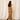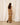 Vestido midi con hombreras y escote en pico, realizado en intarsia con dibujo geométrico en tonos marrón y dorado.