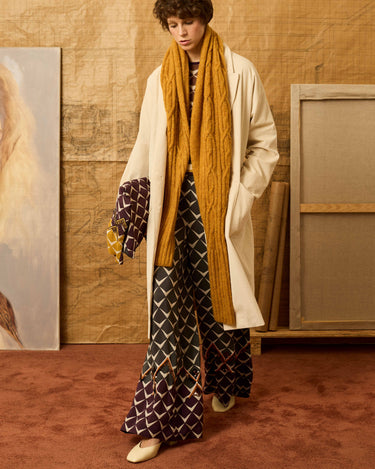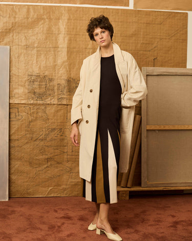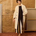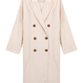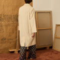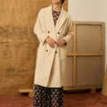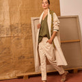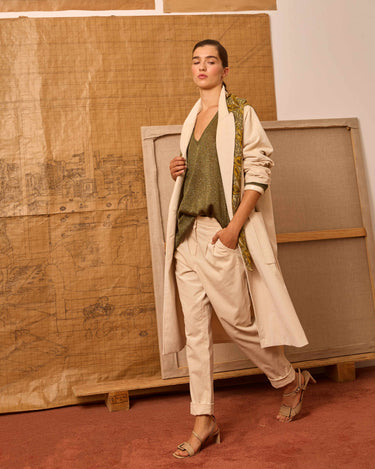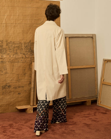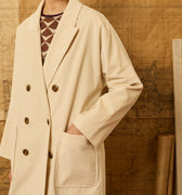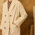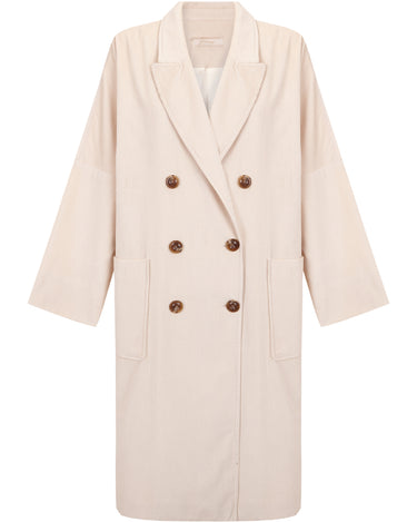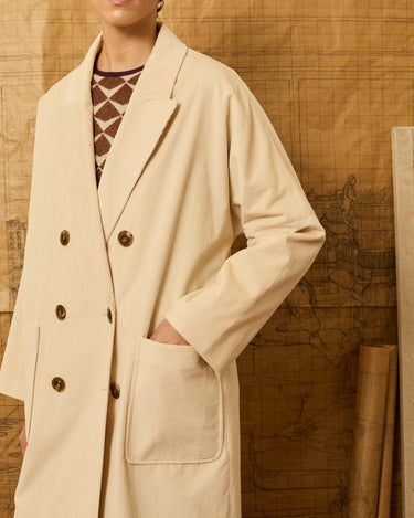Abrigo amplio de pana de algodón en color marfil. Cuello solapa, bolsillos de plastrón y se ata mediante botones