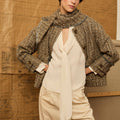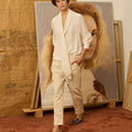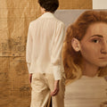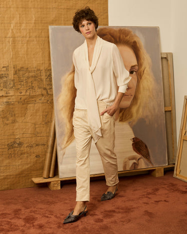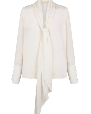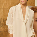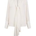 Blusa marfil con lazada de viscosa. Tiene puño alto con 4 botones forrados