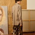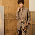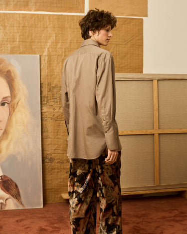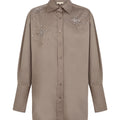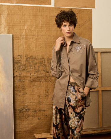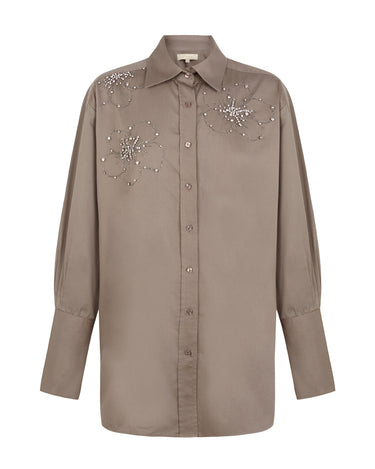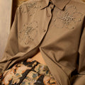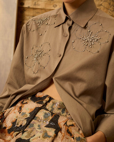 Camisa masculina de popelín de algodón con flores de pedrería bordadas en el delantero.