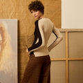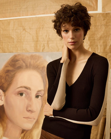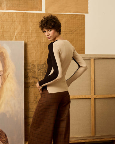 Jersey de cuello pico bicolor, delantero en negro y trasero en color marfil con cortes asimétricos en el bajo y en los puñosP552.751.JER.7511-034_S