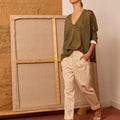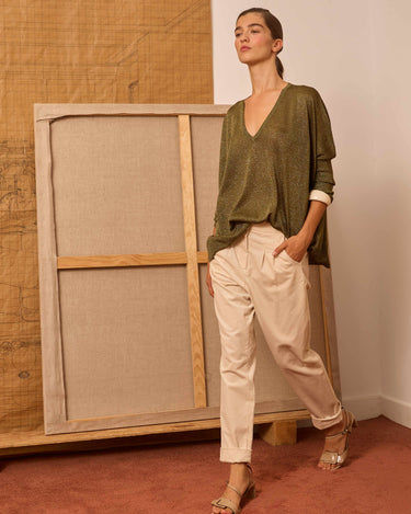 Pantalón baggy de pana en color marfil con pinzas y bolsillos. Con cierre de cremallera, botón y corcheteP552.525.PAN.5254-001_36