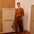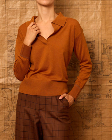 Jersey de punto con cuello solapa y manga larga en color naranja. Tiene detalle de lurex al tono en el inicio del puñoP552.774.JER.7744-102_S