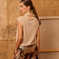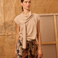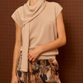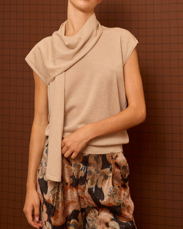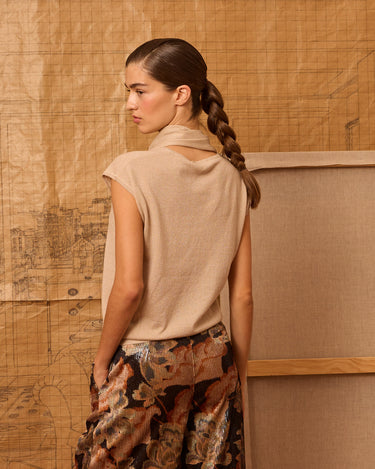 Top sin mangas beige con lazada que nace en la costura del hombro derecho y manga larga en hilatura color beige con un sutil brilloP552.716.TOP.7161-004_S