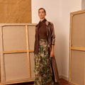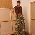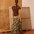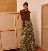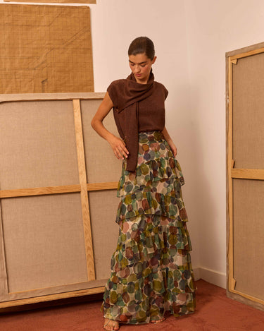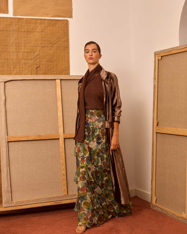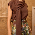 Top sin mangas marrón con lazada que nace en la costura del hombro derecho y manga larga en hilatura color beige con un sutil brilloP552.716.TOP.7161-404_L
