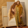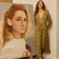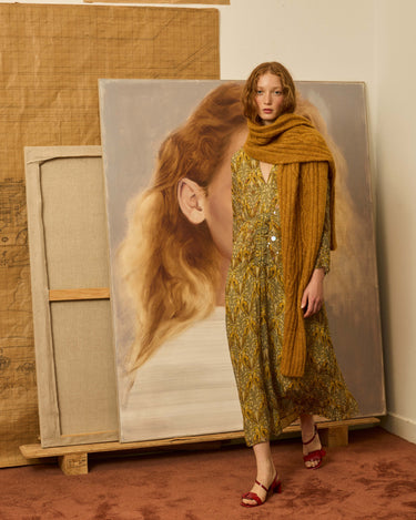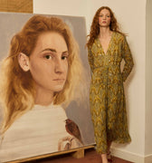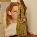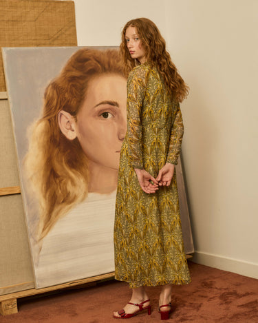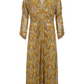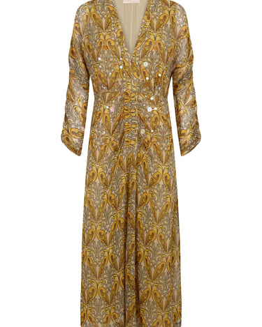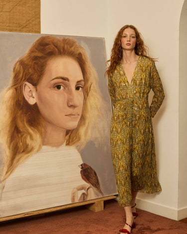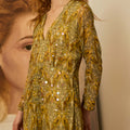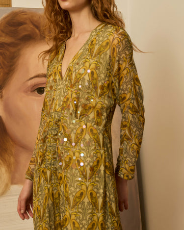 Vestido midi de crinkle de viscosa con estampado estilo art nouveau de pájaros en tonos amarillo. Escote pico y frunces en la parte delantera de la falda. Tiene salpicado de lentejuelas semitransparentes en la parte frontal.
